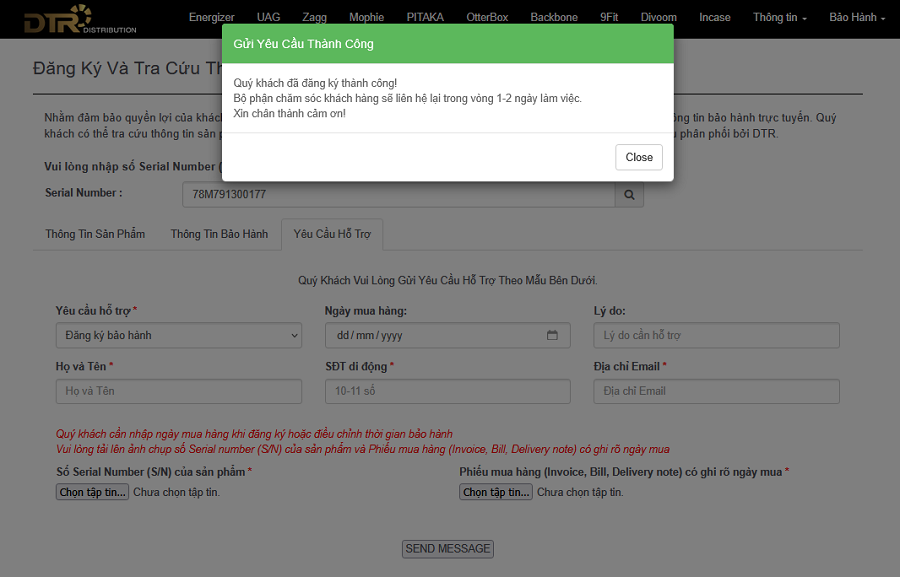 Sau khi điền đầy đủ thông tin cần thiết để đăng ký bảo hành, bạn sẽ nhận được hộp thoại thông báo “Gửi yêu cầu xác nhận thành công” từ hệ thống.